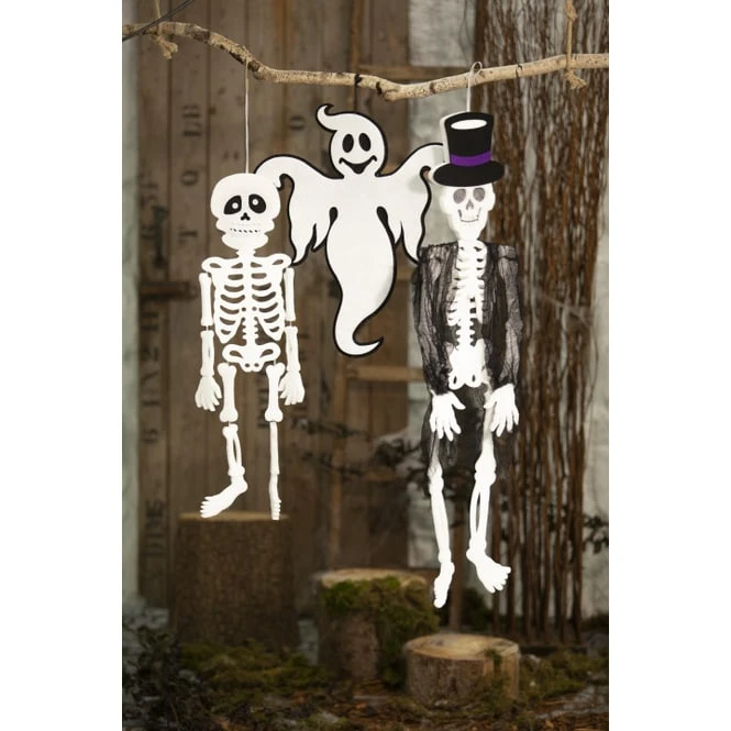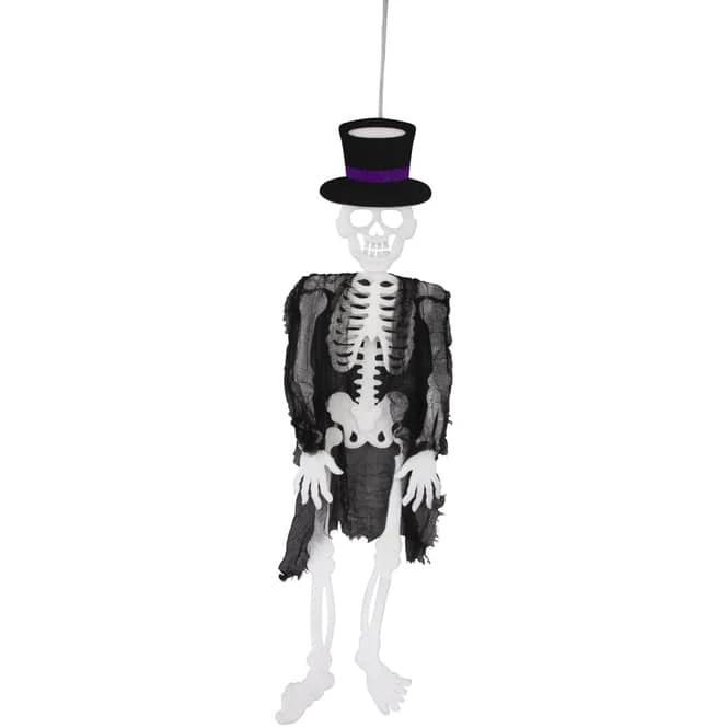 Die passende Dekoration ist vor allem an Halloween einfach unverzichtbar. Wenn Sie auf der Suche nach schaurig-schönen Stücken sind, womit Sie Ihre Räumlichkeiten stilecht herrichten können, kommen Sie mit diesem Kerlchen vollends auf Ihre Kosten! Die tolle Hängedeko kommt in Form eines liebenswerten Skeletts daher, welches aufgrund der liebevollen Gestaltung sowie den gruseligen Stofffetzen ein echter Blickfänger ist. Es verfügt über die Maße 23 x 2 x 96 cm und lässt sich mithilfe der dafür vorgesehenen Schnur mühelos an der gewünschten Stelle anbringen, wo es sofort seine volle Wirkung entfaltet. Ganz gleich, ob im Wohn- oder Esszimmer oder gleich gegenüber der Eingangstür präsentiert – mit dem dekorativen Skelett bleiben fortan wirklich keine Wünsche mehr offen. Also schnappen Sie es sich und erleben Sie unvergessliche Gruselnächte!