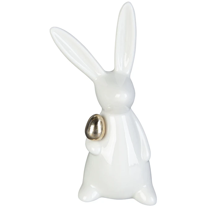Flauschig, langohrig und überaus niedlich – das sind nur einige der Attribute, die man mit Hasen verbindet. Diese haben im Frühjahr bekanntlich Hochkonjunktur, stehen sie doch für Fruchtbarkeit und Neubeginn. Wenn Sie auf der Suche nach einer gelungenen Neuinterpretation des Klassikers sind, haben wir hier genau das Richtige! Der niedliche Dekohase ist genau das Richtige, um dem Winterfrust binnen Sekunden den Garaus zu machen und dem Frühling Tür und Tor zu öffnen. Dieser ist nämlich nicht nur ein echter Augenschmaus, sondern er ist darüber hinaus auch der ideale Bote der blühenden Jahreszeit. Er besteht aus glänzendem Keramik, misst 6,5 x 5 x 13 cm und ist vor allem aufgrund des goldenen Eis ein dekoratives Highlight, welches sich nahtlos in jeden Raum einfügt. Ganz gleich, ob alleine präsentiert oder in Kombination mit weiteren österlichen Elementen in Szene gesetzt – von dem hinreißenden Osterhasen bekommen Sie und Ihre Lieben ganz sicher nicht genug.