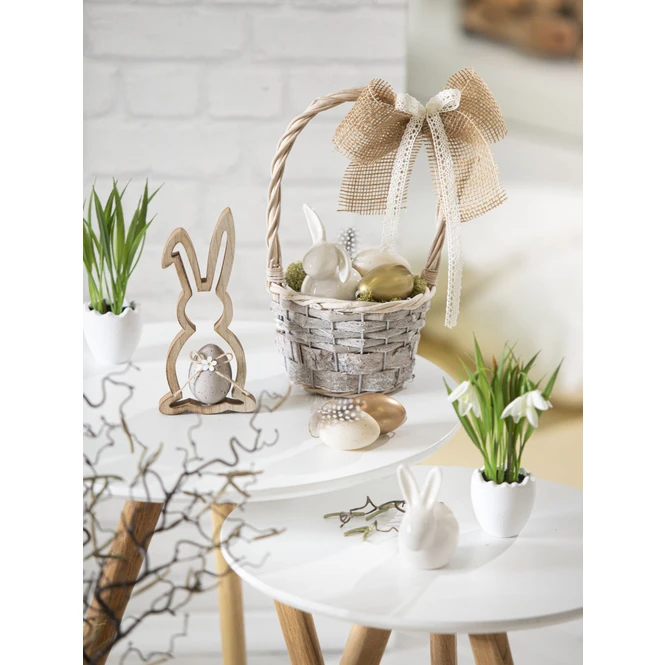 Trendsetter, aufgepasst! Mit dem niedlichen Dekohasen könnt ihr euch beim österlichen Schmücken munter austoben und eurer Kreativität freien Lauf lassen. Dieser ist nicht nur ein echter Augenschmaus, sondern darüber hinaus auch genau das Richtige, um grenzenlosen Dekospaß zu erleben. Er besteht aus Holz, ist 9 x 2 x 20 cm groß und insbesondere aufgrund des liebevoll gestalteten Eis in der Mitte der Silhouette ein dekoratives Highlight. Mithilfe der natürlichen Farbgebung fügt sich der hinreißende Hase nahtlos in jeden Raum ein und verbreitet so mühelos ein wohliges Osterambiente, von welchem ihr und eure Lieben ganz sicher nicht genug bekommt. Also schnappt ihn euch und dekoriert munter drauflos!