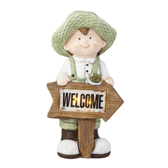 Junge mit Solar LED Schild – Welcome – aus Magnesia – ca. 25,5 x 16,5 x 42 cm