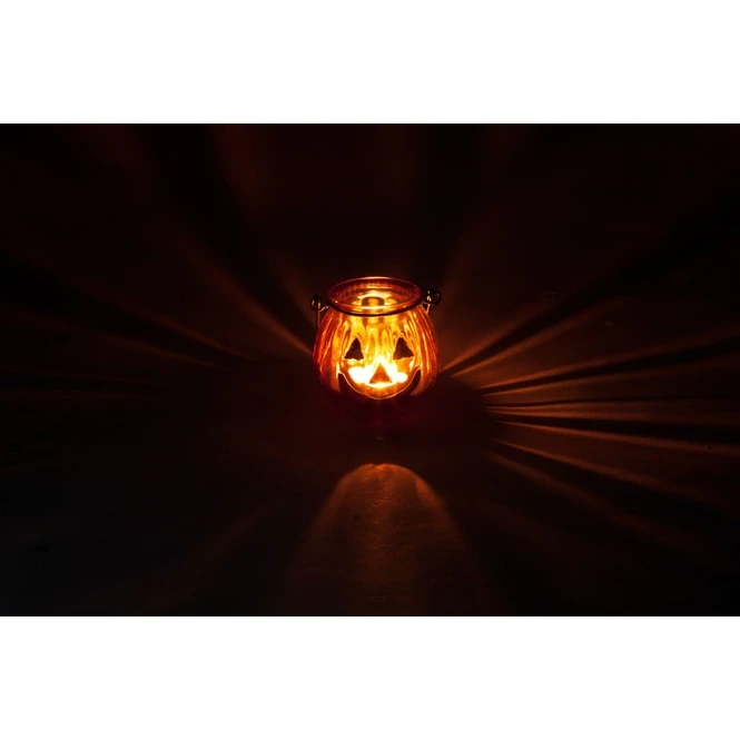 Kürbisse sind ein ebenso fester Bestandteil von Halloween wie „Süßes-oder-Saures“, gruseliges Krabbelgetier oder fürchterliche Kostüme. Wenn Sie noch auf der Suche nach augenscheinlicher Dekoration für Ihre Gruselfeier sind, liegen Sie mit diesem Stück goldrichtig! Mit dem lustigen Teelichtglas tauchen Sie Ihre vier Wände binnen Sekunden in eine behagliche Gänsehautatmosphäre. Es besteht aus Glas, misst ca. 7,5 x 7,5 cm und sorgt dank dem liebenswerten Kürbis im Handumdrehen für eine fröhliche Partystimmung, von der Sie und Ihre Lieben niemals genug bekommen. Somit ist das Glas genau das Richtige, um die Blicke mühelos auf sich zu ziehen und die Gäste in Kombination mit einem wohlig flackernden Teelicht (nicht im Lieferumfang erhältlich) auf besondere Weise willkommen zu heißen.