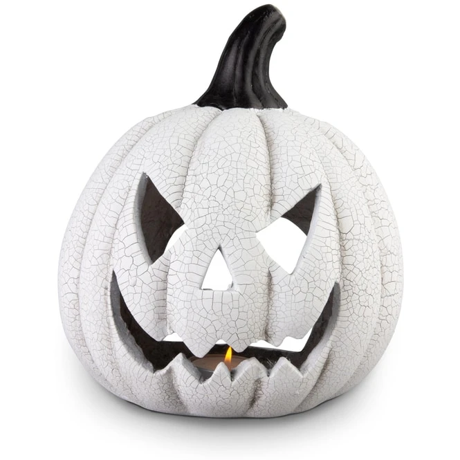 Sie sind ein ebenso fester Bestandteil von Halloween wie „Süßes-oder-Saures“, grauenerregende Kostüme oder fürchterliches Krabbelgetier – die Rede ist von Kürbissen. Wenn Sie noch auf der Suche nach einem echten Prachtexemplar, liegen Sie mit diesem goldrichtig! Mit dem supercoolen Windlicht können Sie in Ihren vier Wänden in Sekundenschnelle ein schaurig-schönes Halloweenambiente aufkommen lassen und zugleich besondere Akzente setzen. Er besteht aus robustem Magnesia, misst ca. 26 x 24 x 30 cm und sorgt dank seiner fürchterlichen Fratze im Nu für eine fürchterlich-schöne Gänsehautatmosphäre, von welcher echte Gruselfans ganz sicher nicht genug bekommen. Dadurch eignet sich der Kürbis ideal, um die Party in Kombination mit einem flackernden Teelicht (nicht im Lieferumfang erhältlich) stilecht einzuläuten und das eine oder andere zartbesaitete Gemüt gehörig zum Schaudern zu bringen. Also lassen Sie Ihrer Fantasie freien Lauf und schmücken Sie munter drauflos!
