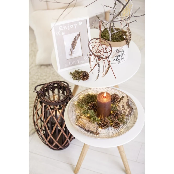 Sie sind auf der Suche nach geschmackvoller Dekoration, die nicht nur der Blickfang in Ihrem Zuhause ist, sondern darüber hinaus auch zum Entspannen und Träumen einlädt? Dann werden Sie dieses Goldstück lieben! Das stilvolle Windlicht besteht aus klarem Glas, welches mit naturbrauner Weide ummantelt ist und ist insbesondere dank dem außergewöhnlichen Design sowie dem aus Kordel bestehenden Henkel ein dekoratives Highlight. Durch die Vereinigung aus verschiedenen natürlichen Materialien sowie einer Höhe von 41 cm fügt es sich nahtlos in jeden Raum ein und taucht ihn in Verbindung mit einem wohlig flackernden Teelicht (nicht im Lieferumfang enthalten) in ein heimeliges Wohlfühlambiente, von dem Sie und Ihre Lieben in der dunklen Jahreszeit garantiert nicht genug bekommen. Darüber hinaus eignet sich die trendige Laterne auch hervorragend für all diejenigen Pragmatiker, die eine dezentere Dekoration bevorzugen, die Modernität jedoch nicht vernachlässigen möchten.
